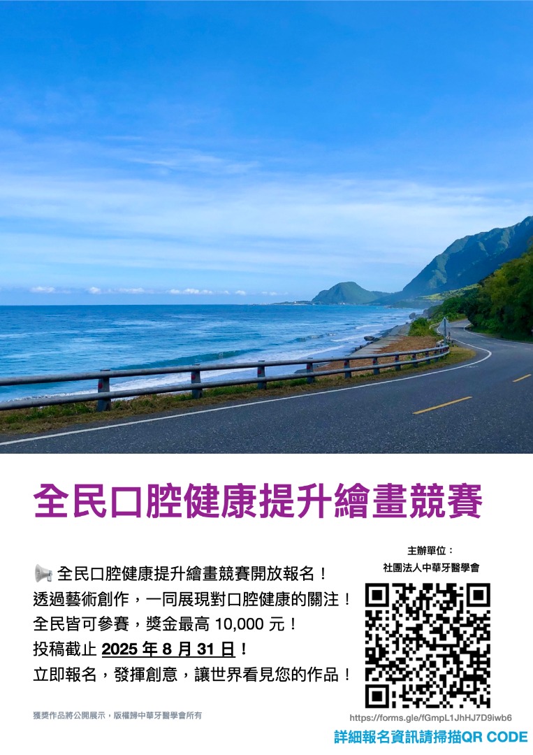 中華牙醫學會主辦[全民口腔健康提升繪畫競賽],歡迎繪圖高手的您,或是您身邊的親朋好友,踴躍報名參加。活動有分組,歡迎掃描QR code即可報名參加!大家一起來!提升口腔健康Go!Go!Go!